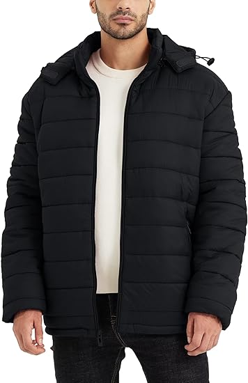 Men's Lightweight Puffer Jackets Detachable Hood Water-Resistant Casual Winter Coat Hooded Insulated for Travel Ski