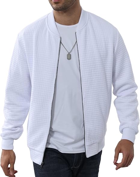 Mens Lightweight Bomber Jacket Casual Plaid Jacquard Varsity Jacket Coat with Zipper Pockets