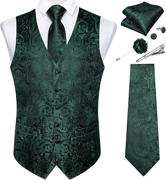 Mens Paisley Vest Tie Set with Lapel Pin Tie Clip 7PCS Silk V-Neck Suit Waistcoat and Necktie for Tuxedo Wedding